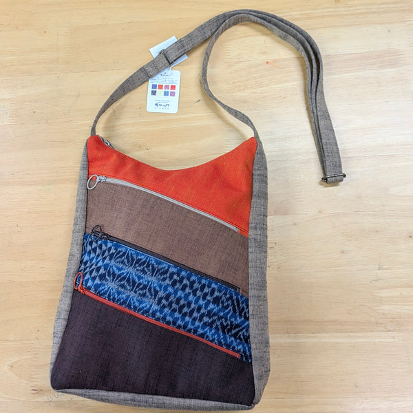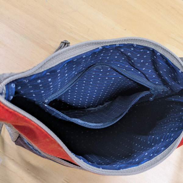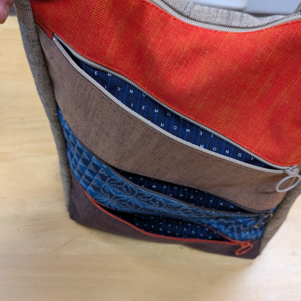 ファスナーポケットが4つ、(中にも一つ)でファスナーの取っ手はリングでとても使いやすい機能的で個性的なショルダーバッグです。口もファスナーです。