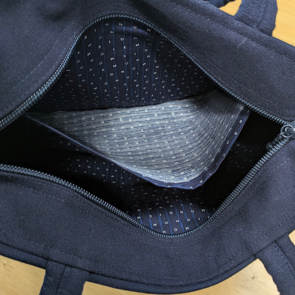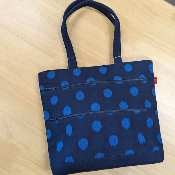 久留米絣ちょうどよい大きさのトートバッグです。ファスナーポケットが全面に2つ、後ろに一つ、中にもポケットがあり便利てす。口もファスナーです。