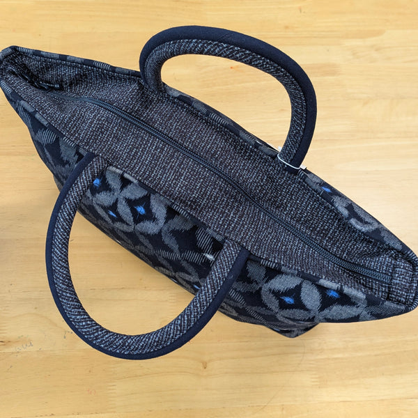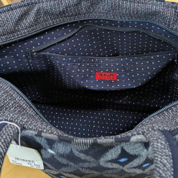 儀右エ門の大きいトートバッグです。習い事にも一泊旅にも活躍します。中には大きめのファスナーポケットと、携帯メガネや鍵などさっと入れられる便利なポケットが2つあります。