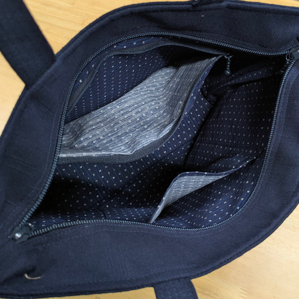 儀右エ門トートバッグ。上質で実用的な日本伝統的織物、久留米絣の綿100%風合いがあります。