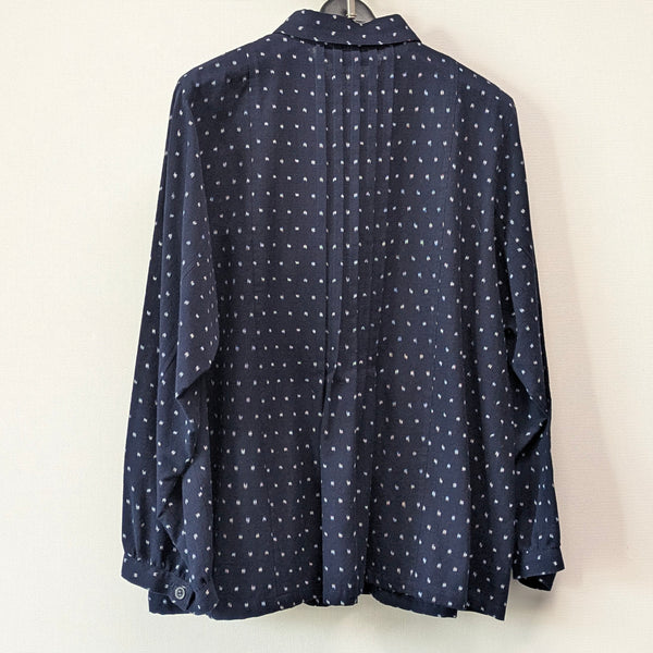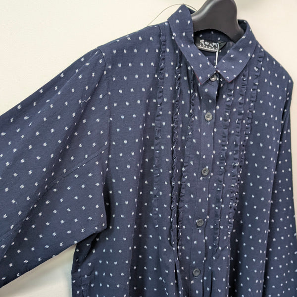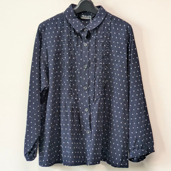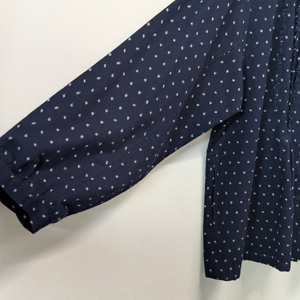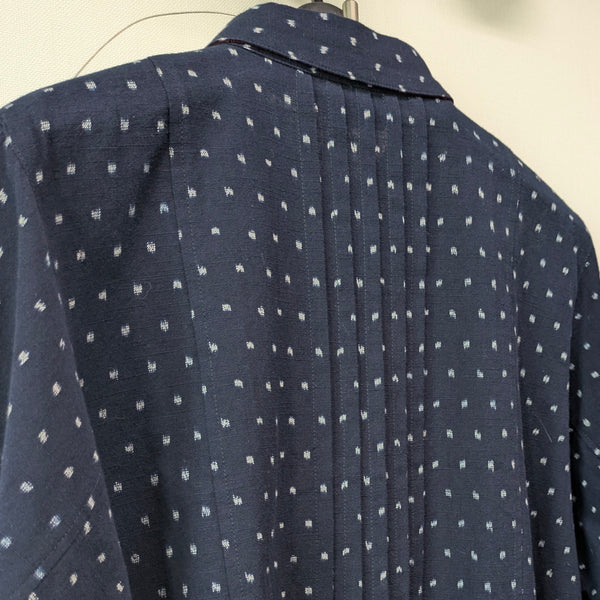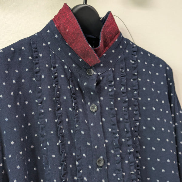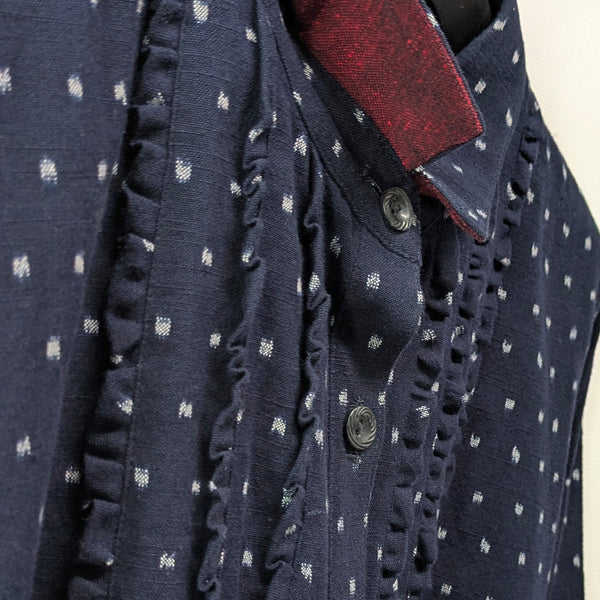 儀右エ門。紺に白い小さい絣。前はフリルタック。襟裏にちらっと赤。ふんわり袖のふわっと大人可愛い上品な一点です。両サイドにポケットがあります。