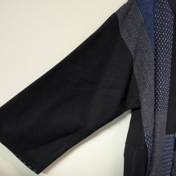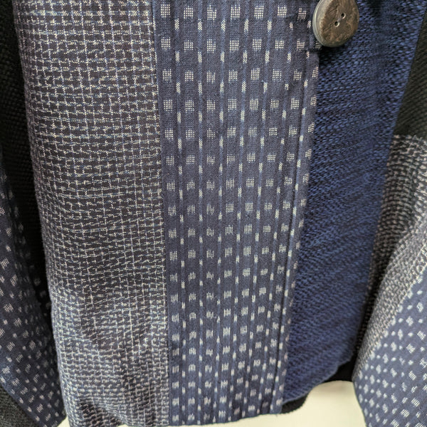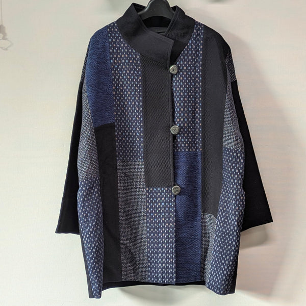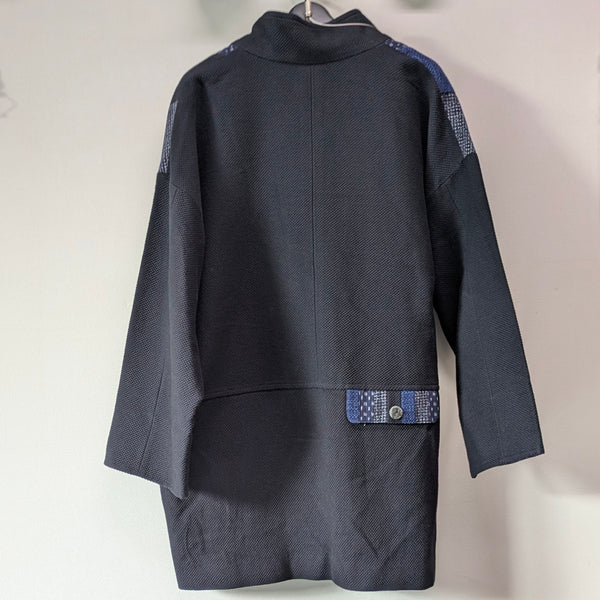 上質を日常に。温かく着心地の良い久留米絣。儀右エ門のおしゃれなジャケットコート、普段に活躍します。袖口は、折り返すと紺白の絣です。