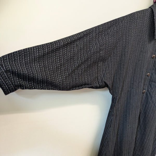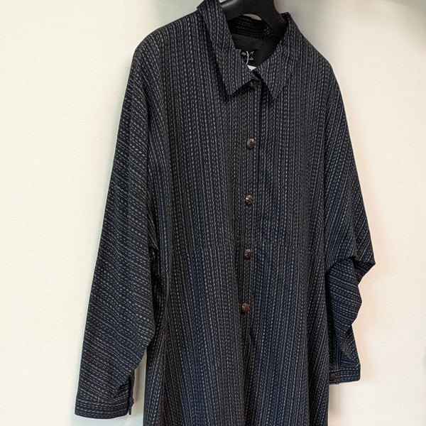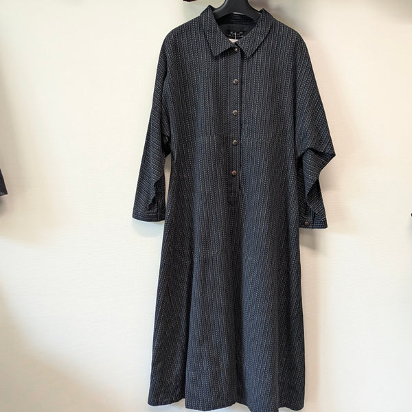 お出かけに!上質な日常に!久留米絣儀右エ門の高級感ある着心地の良い柔らかなロングワンピースです。裏付きで温かく春秋冬と着ていただけます。上品なスタイリッシュなワンピースでありながら、肩腕周りは、ゆったりしたデザインです。両サイドにポケットがあります。