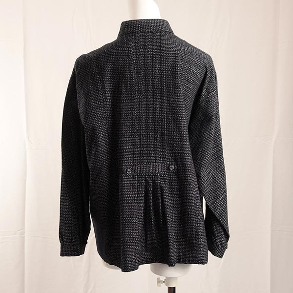 お出かけに!上質な日常に!着心地の良い久留米絣です。高級感ある文人絣のフリル、プリーツで、手のこんだオシャレなお出かけ用のブラウスです。後ろのプリーツの腰のところにはバックル様の飾りボタンのオシャレなデザインです。シーズンレスで年中着ていただけます。両サイドにポケットがあります。