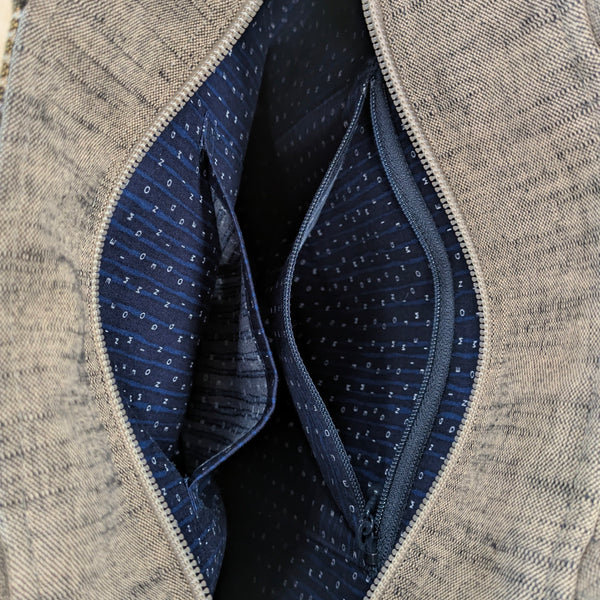 儀右エ門トートバッグ。上質で実用的な日本伝統的織物、久留米絣の綿100%風合いがあります。お買い物のお供に、お出かけに!日常に愛着ある一点になります。