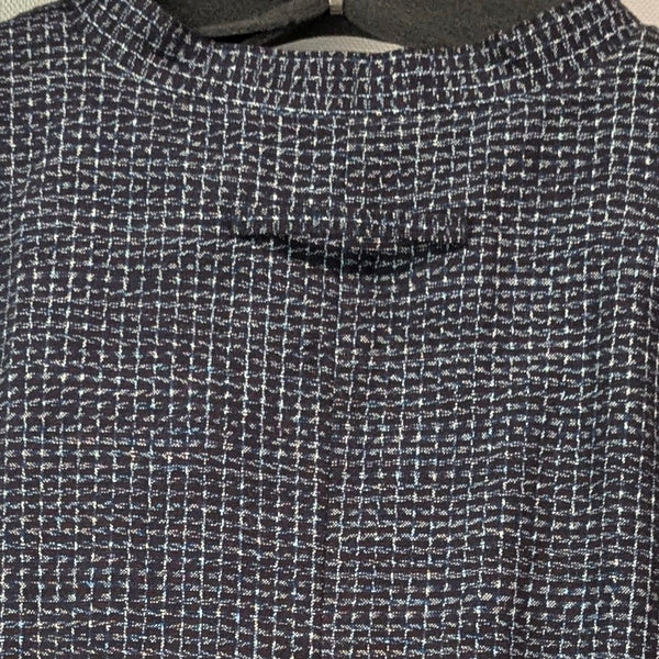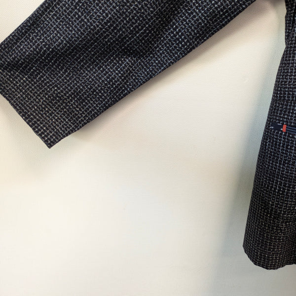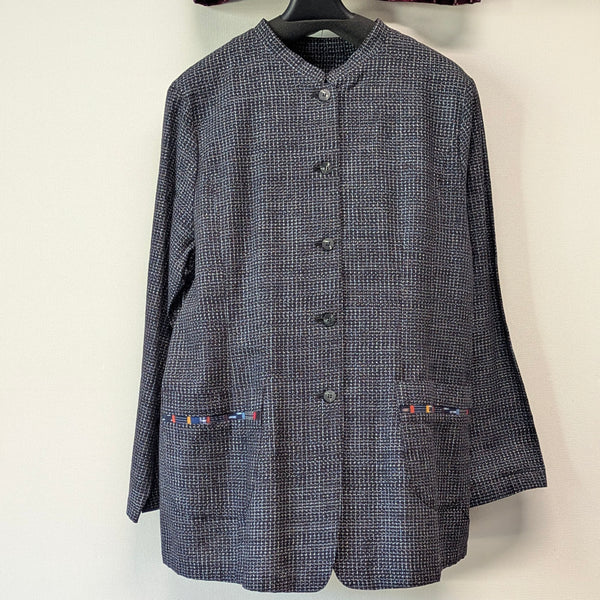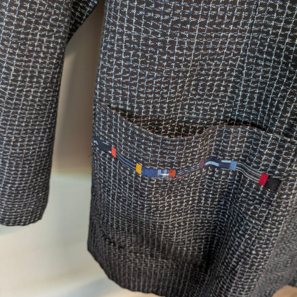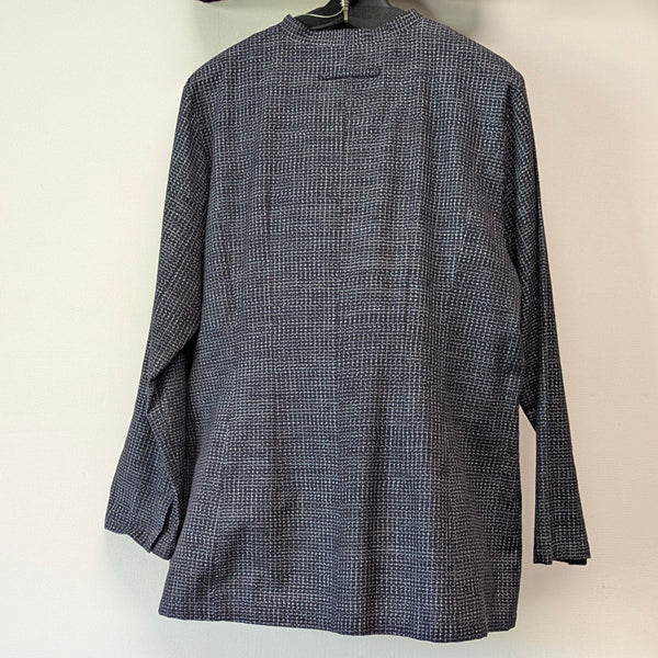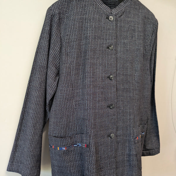 儀右エ門のジャケット風ブラウス。濃紺にみえる文人絣。前も後ろもタック使いできれいなシルエットです。袖はストレート。カラフルパッチのラインの入ったパッチポケットが2つあります。